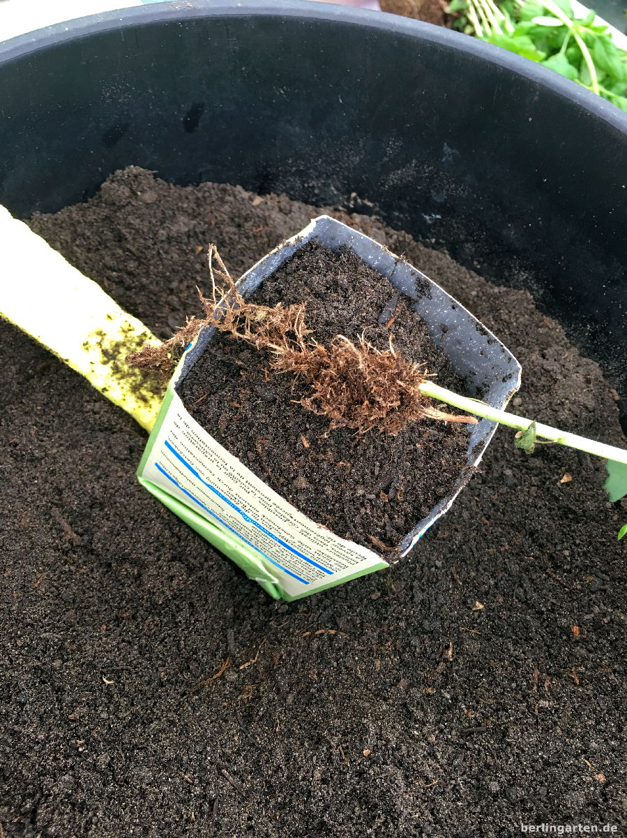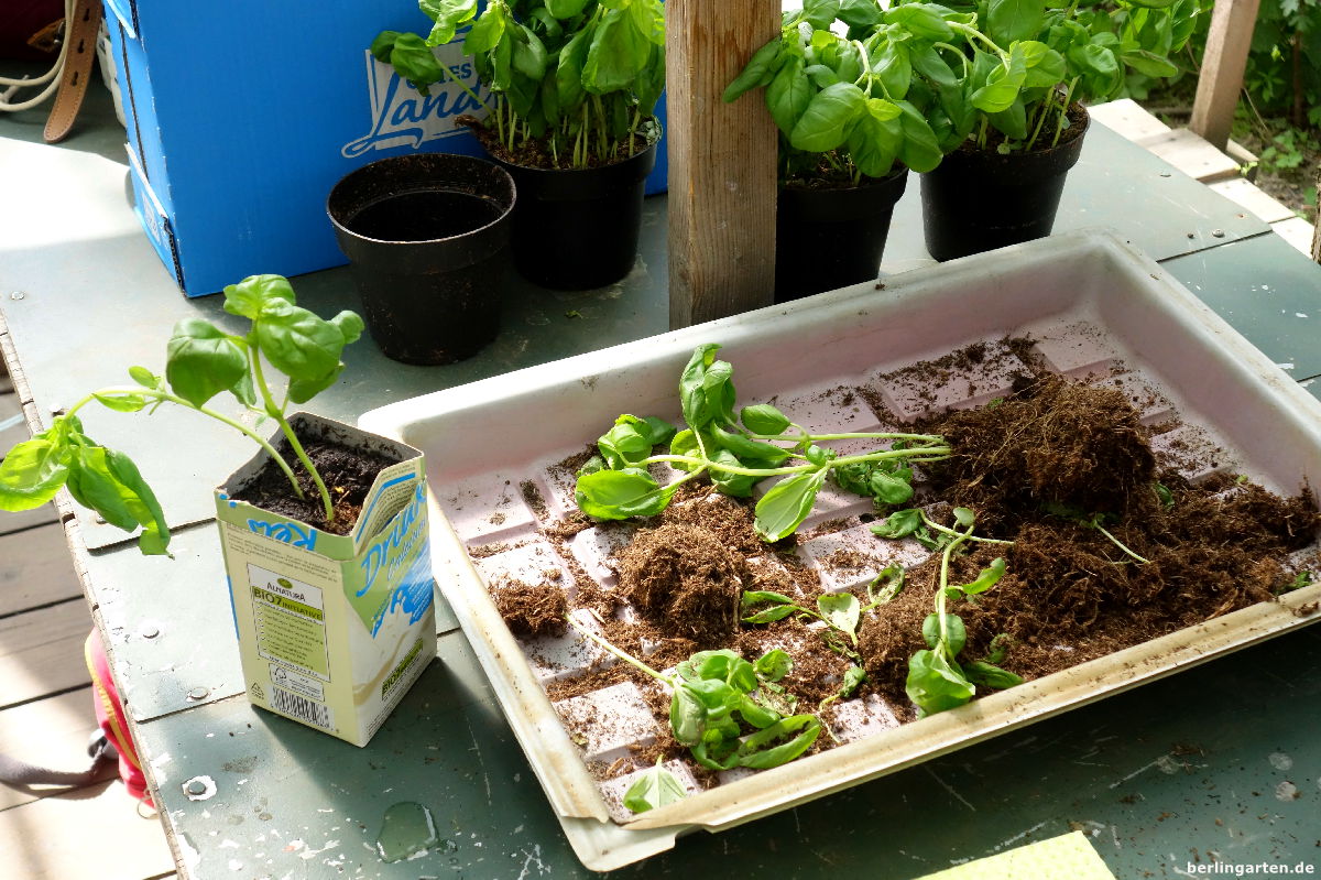- Pflanze das Basilikum ein und gieße einmal an, damit sich Erde und Wurzeln gut verbinden