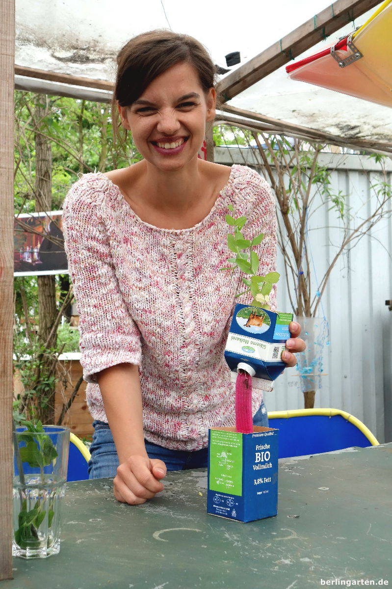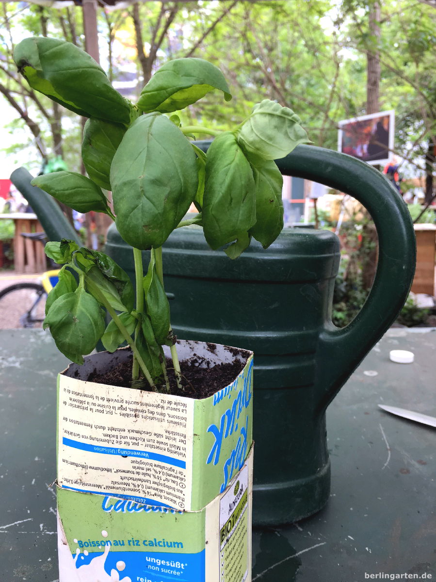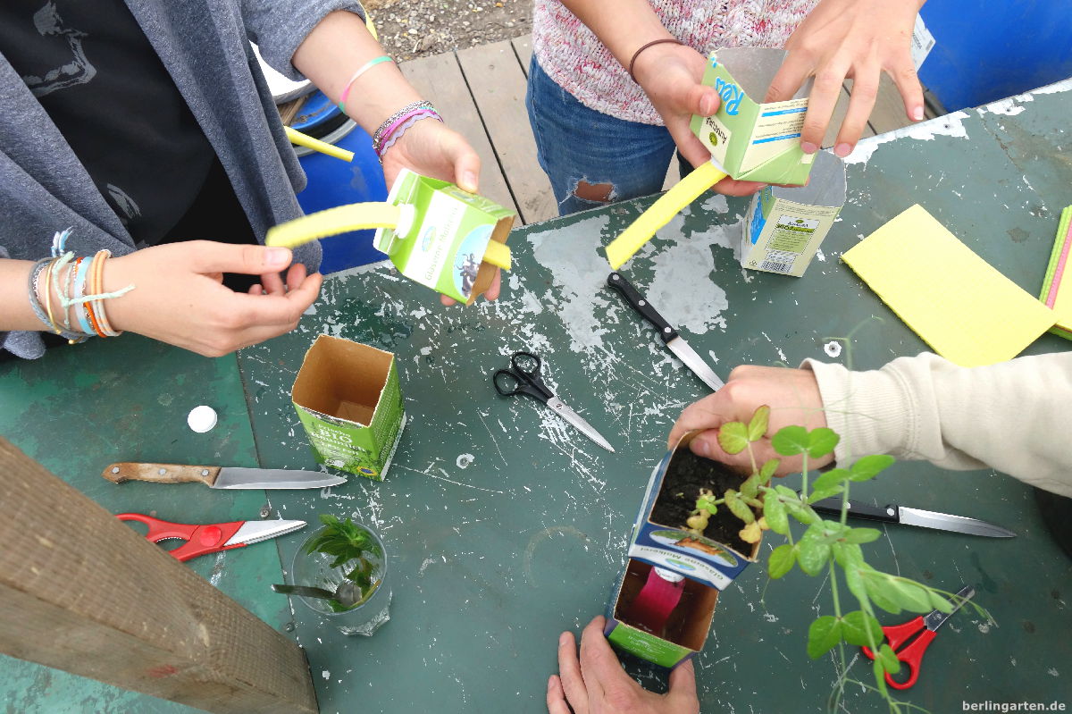 An diesem Nachmittag stellte sie überdies zusammen mit Oliver Boris vom Prinzessinnengarten eine kreative Idee vor, wie man mit Upcyclingmaterial ein Pflanzgefäß für Kräuter oder auch zur Aussaat fertigen kann.