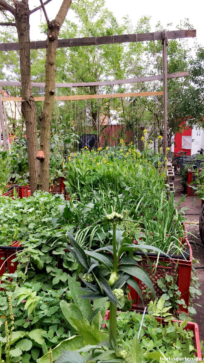 - Es herrscht eine große Gemüsevielfalt im Prinzessinnengarten. Für Rankgemüse werden Seile gezogen