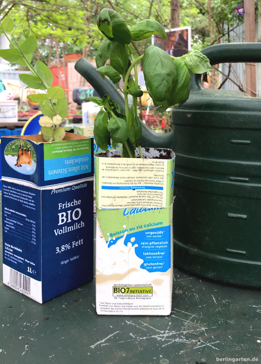 Kräutertöpfe mit Wasserreservoir aus Tetrapaks.