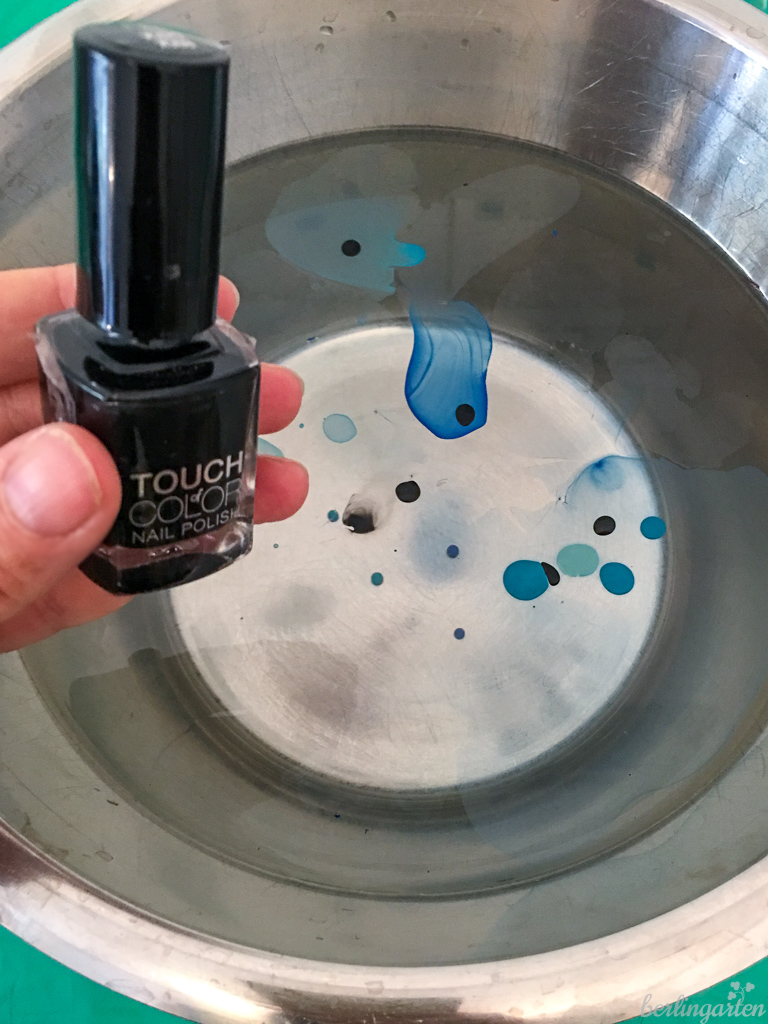 Tropfe Nagellack ins Wasser, er wird auf der Oberfläche schwimmen oder partiell absinken. Du musst ein wenig experimentieren, wie viel du brauchst, da sich die Nagellacke je nach Fabrikat und Alter des Produkts unterschiedlich verhalten. Ich träufel mehrere Farben gleichzeitig ins Wasser. Für einen Marmor-Effekt kannst du mit einem Holzstäbchen die Farben vermischen.