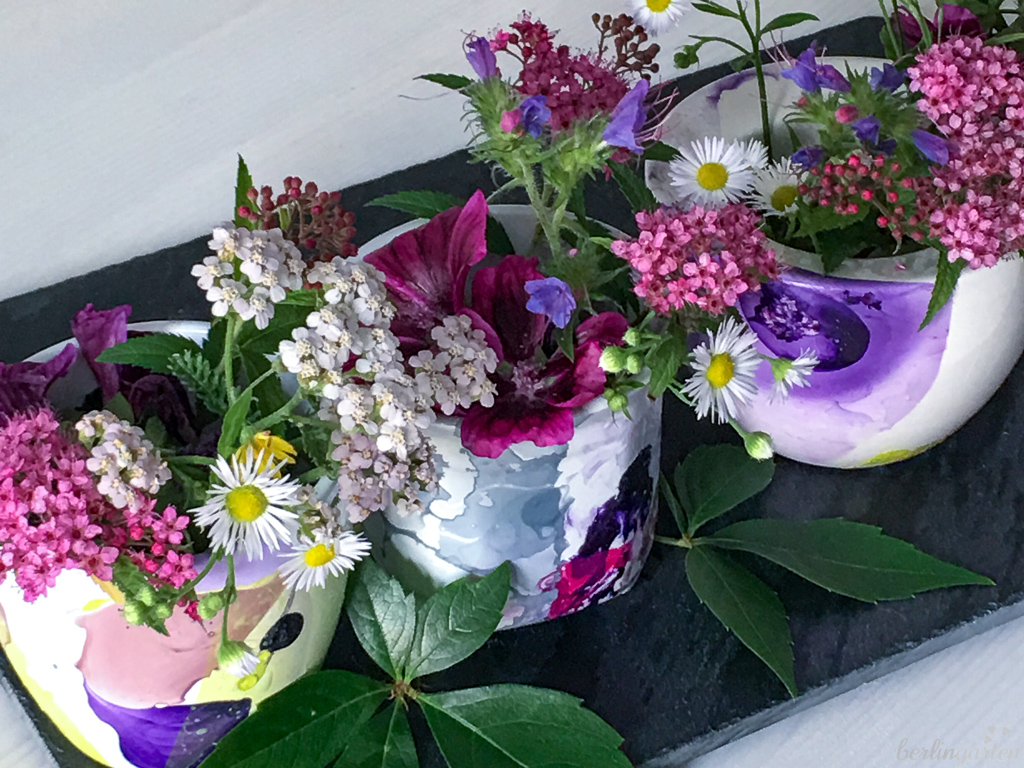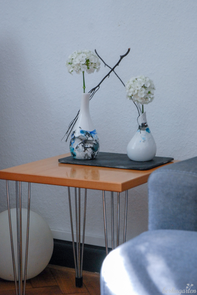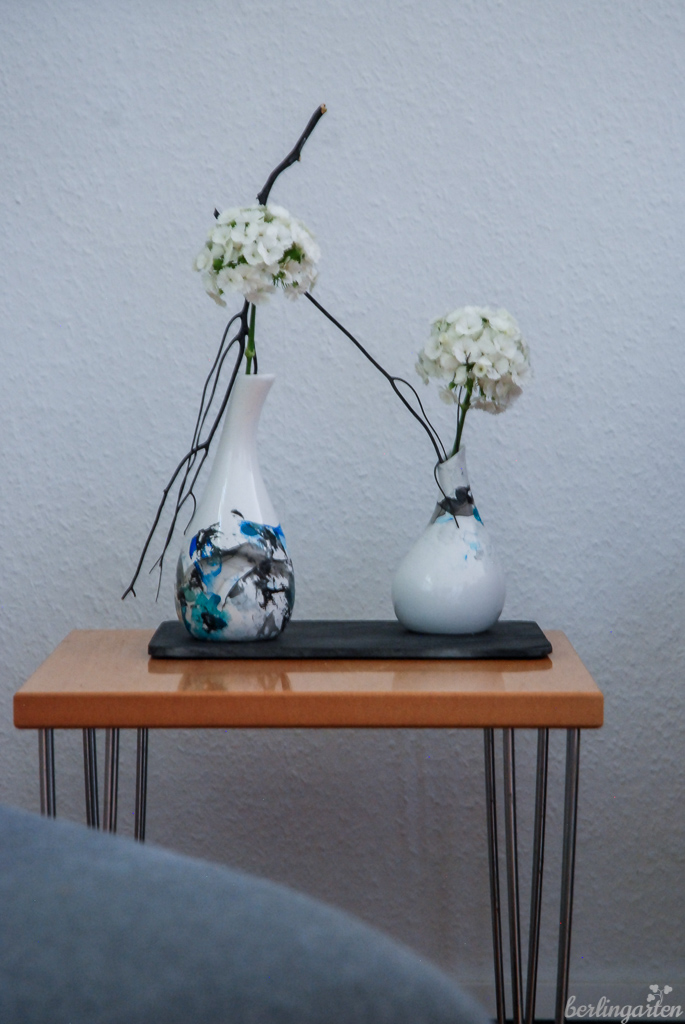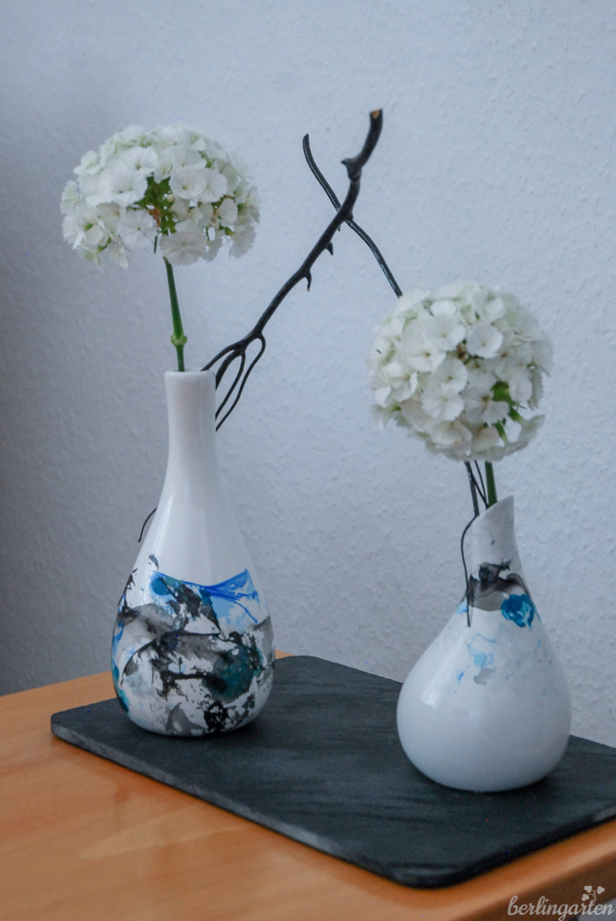 Seit ich zusammen mit lieben Ikebana-Freundinnen schlichte weiße Vasen in kleine Kunstwerke verwandelt habe, gibt’s kein Halten mehr: Ich fertige sie als Geschenke oder passe sie für mich durch farblich passenden Nagellack meiner jeweiligen Deko nach Lust und Laune individuell an.