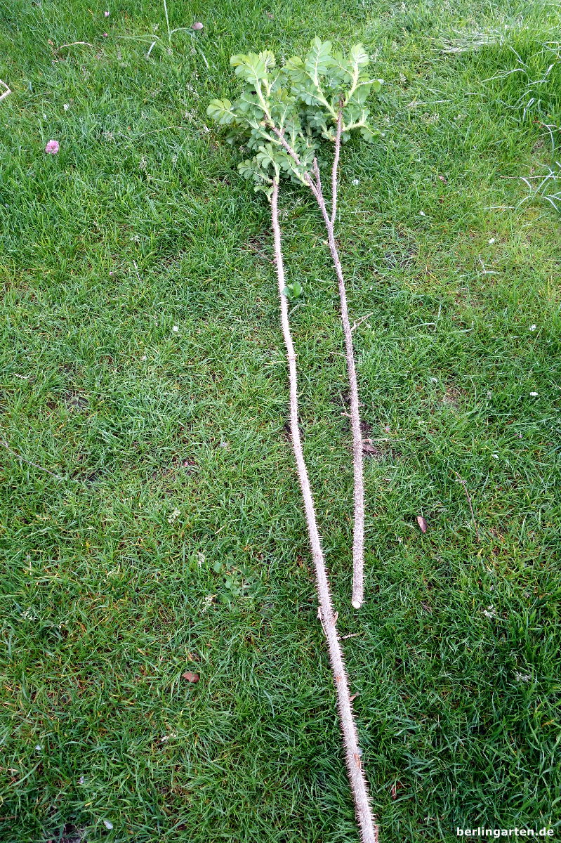 Ich habe mich jetzt an die Apfelrose Rosa rugosa gemacht. Sie wurde drei Jahre lang nur oberflächlich geschnitten und stand nun als knorrige alte Lady vor mir. Da hilft kein langes Lamentieren, sondern nur ein beherzter Rückschnitt auf höchstens Kniehöhe. Über einem nach außen zeigenden Auge nehme ich alles ab, dünge, gieße und freue mich, dass mir bald ein Jungspund entgegenspringt. Das mache ich übrigens auch regelmäßig mit großen Parkrosen so – ich setze sie nach der Blüte bis auf die Veredelungsstelle zurück, dann treiben sie neu aus und passen wieder in meinen 350 qm Garten, blühen wie verrückt und sind vital wie eh und je.*