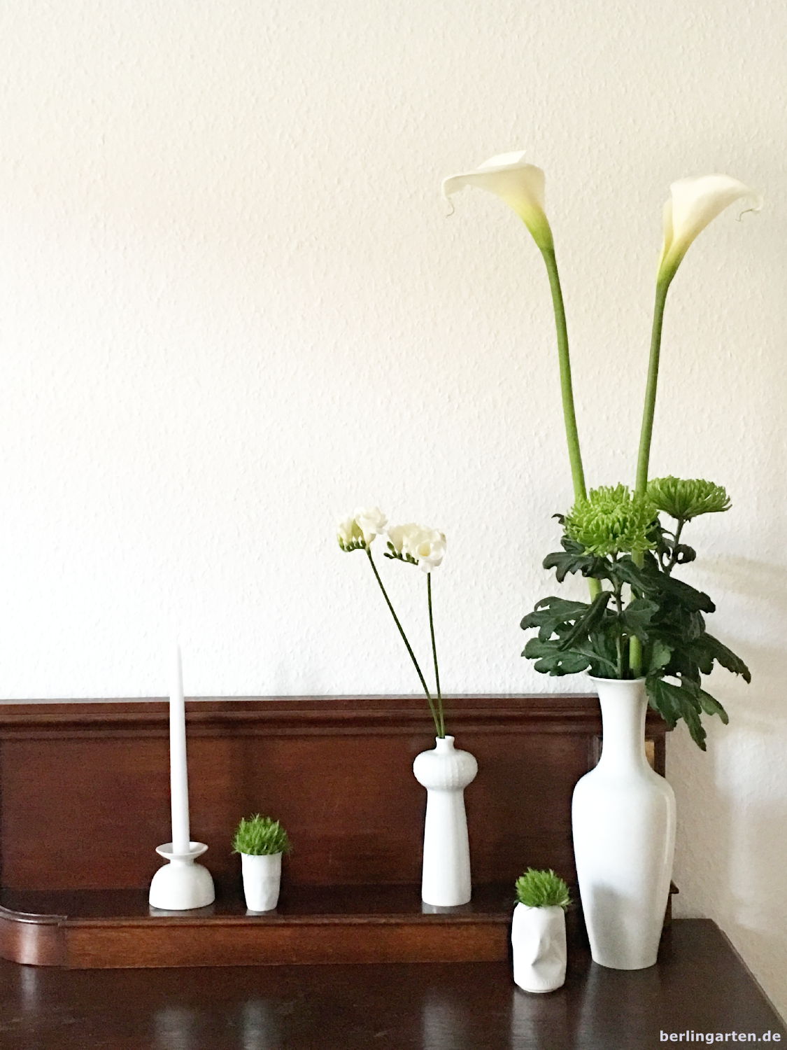 Da habe ich wieder etwas dazu gelernt, liebe Xenia, grüne Chysanthemen und grüne Bartnelken sind neu für mich. Du bist also auf ‚Nummer sicher‘ gegangen und hast Dein Arrangement mit vier Vasen und einem Kerzenleuchter nach italienischem Rezept – Applaus garantiert – gestaltet. Ich habe gerade einen Italiener zu Besuch, der da meint, dass da noch das Rot fehlt. Aber hier zählt ja nur meine Meinung und die ist, dass Deine Kollektion grün-weiß mit den schönen Vasen, den weißen Callas und Freesien sehr edel aussieht. – Übrigens noch ein ganz liebes DANKE! Eine schöne neue Woche und herzliche Grüße Edith