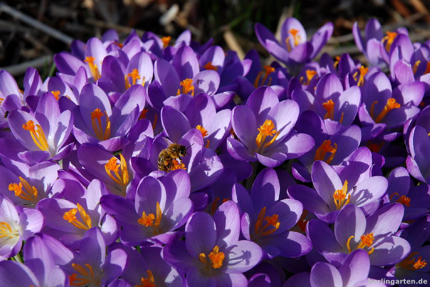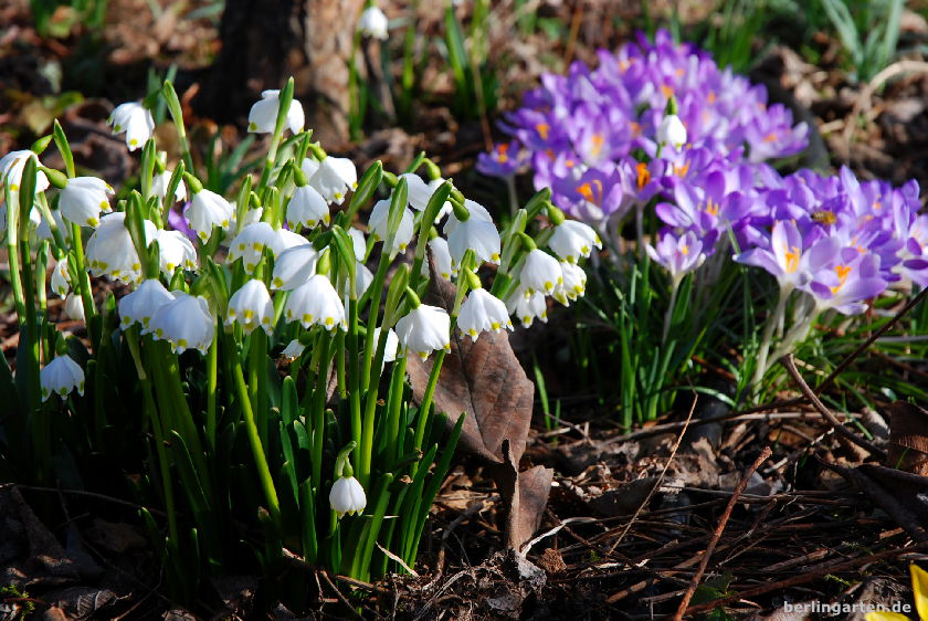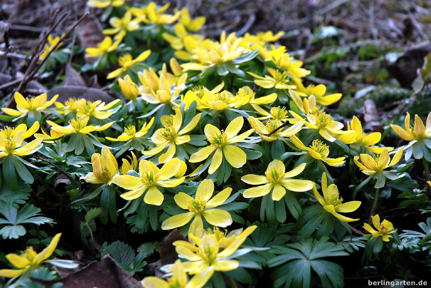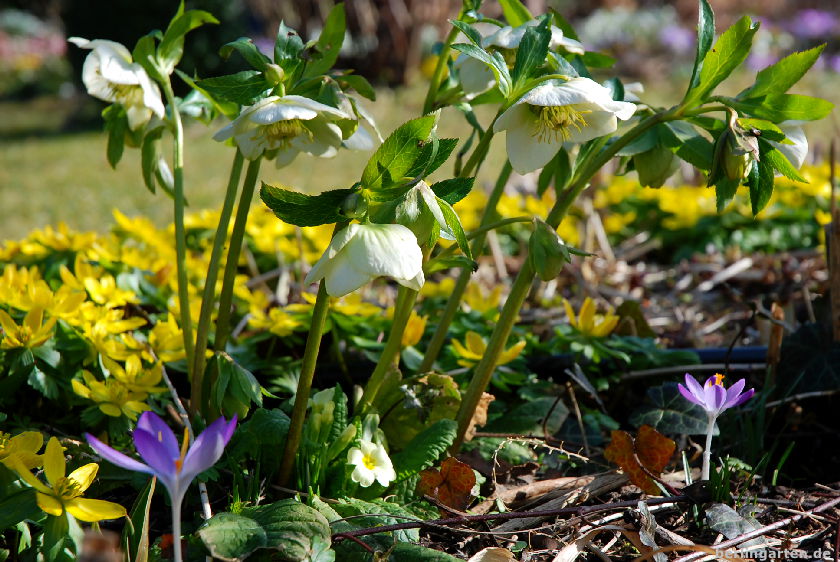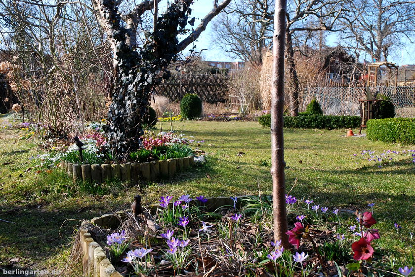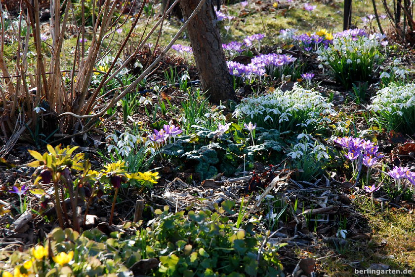 D.h. ich bin selbst bei klirrender Kälte auf dem Boden herumgerobbt und habe beim Erscheinen der hübschen, an Harlekin-Kragen erinnernden Winterlingsblättchen diese gaaanz vorsichtig aufgenommen und an freie Stellen gesetzt, die ich per Kamera im vorigen Spätwinter festgehalten hatte. (Später, wenn Samen angesetzt sind, kann man die natürlich auch abgreifen und einfach an andere Stellen werfen.) Und Schneeglöckchen geteilt und verpflanzt, sobald die Blüte sich dem Ende näherte – „in the green“, wie die Engländer sagen. Bei den Krokussen habe ich einst Tausende von Zwiebelchen gesetzt (ca. 50 pro Quadratmeter), um den Ameisen genügend Material zum Verschleppen und so zum Vermehren zu bieten. Und dann ist mit der Arbeit aber auch Schluss, denn menschliches Hacken und Graben und Wurschteln mögen die Kleinen gar nicht. Man will zur Fortpflanzung schließlich irgendwann auch mal in Ruhe gelassen werden.