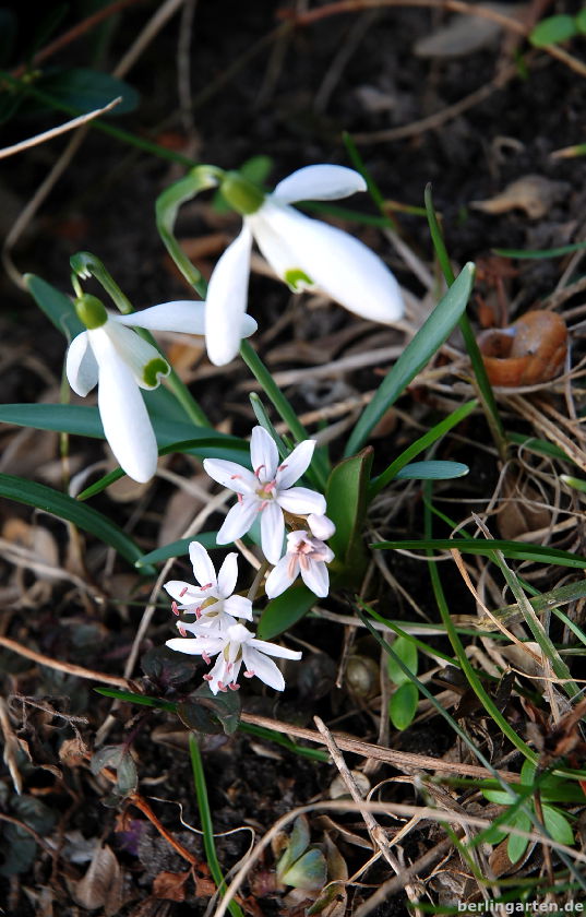 Ergänzt werden die drei Frühaufsteher unter den Zwiebelblühern bei uns durch Märzbecher Leucojum vernum, Puschkinien Puschkinia scilloides und das Winter-Alpenveilchen Cyclamen coum. Ganz besonders früh ist auch das Blausternchen Scilla bifolia dran – bei mir müsste es allerdings Rosasternchen heißen, denn die rosa Variante ‚Rosea‘ ist einiges früher als die blaue. Ihr Ausbreitungsdrang ist gewaltig, dafür liebe ich sie! (Ich denke, dazu schreibe ich mal einen eigenen Artikel, wenn sie in ein paar Tagen vollends aufgelaufen ist.)
