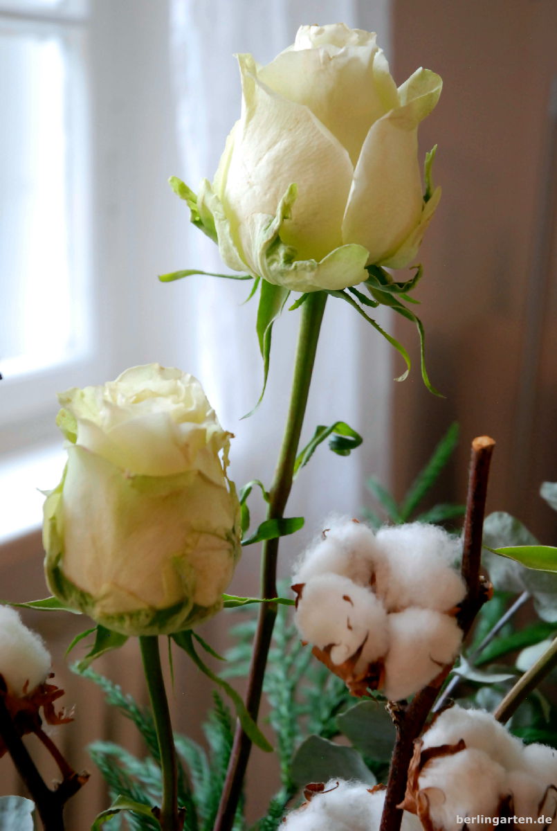 Das ist ein echt kreativer Weihnachtsstrauß, liebe Xenia, sehr schön, verspielt, edel, elegant… Solche ‚Zutaten‘, abgesehen vom Silberblatt und den Rosen, bekommt man wohl nur in Berlin. Die Baumwolle sieht richtig wintermäßig aus. Hier habe ich sie noch nie gesehen. Das Grün der Sicheltanne paßt super zu dem Weiß. Ich hatte mal eine kleine Sicheltanne gekauft, sie zuerst in einen Kübel und später, als sie einen Meter hoch war, an die Nordseite des Hauses gepflanzt. Dort ging sie ab wie eine Rakete, erreichte bald die Dachrinne, drückte diese ein und wenn es stürmte, hörte der Hausherr immer ein Klopfen. Sie mußte weichen. Das macht mich heute noch traurig. Eigentlich ist das eine Rarität. Ach ja, süß ist auch der kleine Engel mit dem Heiligenschein und allerliebst die Schneeglöckchen, die von der Sicheltanne baumeln. Übrigens, in meinem Garten blühen seit dem 4. Advent 2 Galanthus elwesii (Großes Schneeglöckchen).