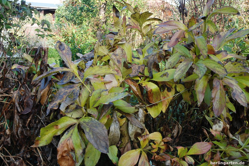 - Krankes Laub, hier von Paeonien, gehört abgeschnitten und in die Biotonne