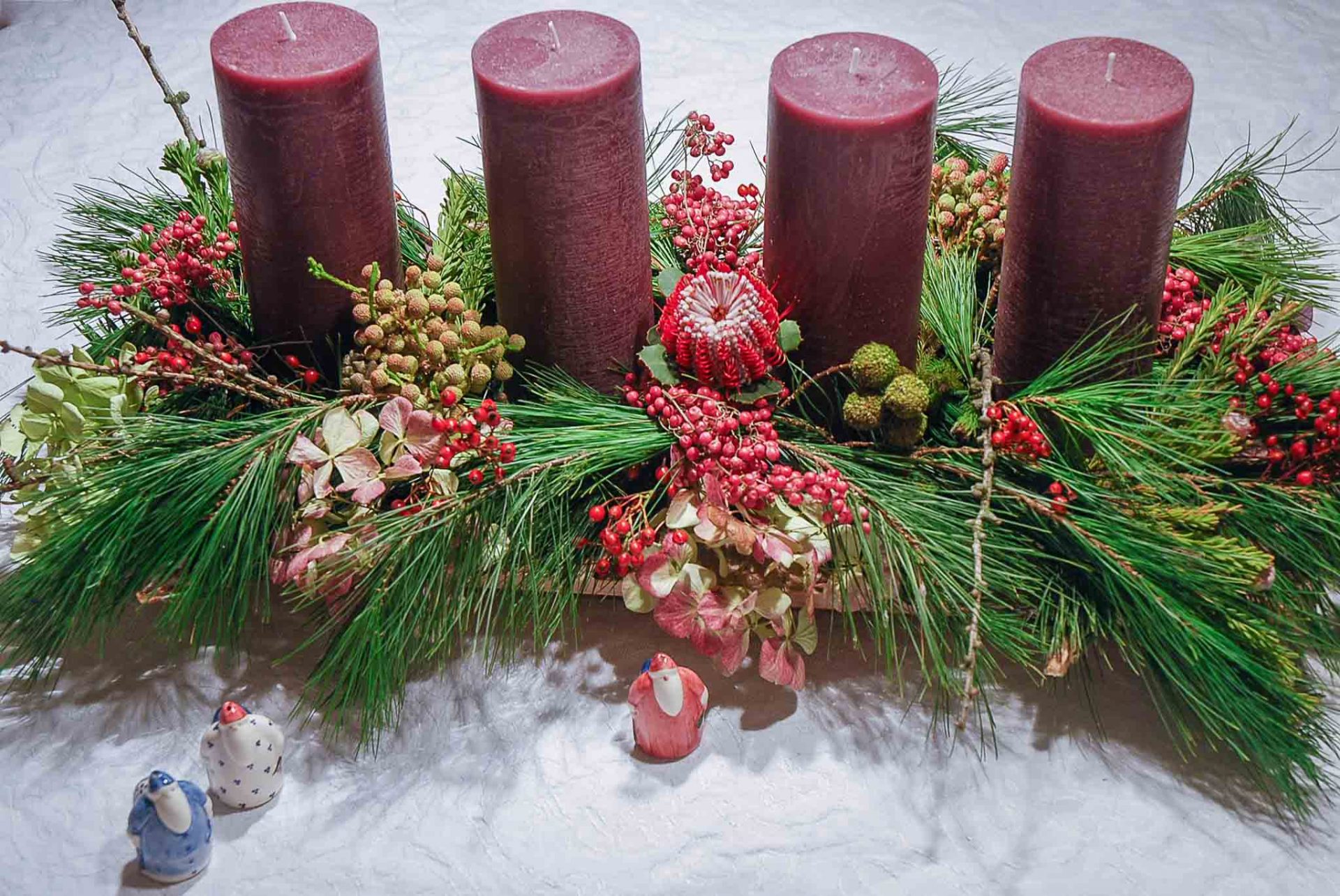 Wenn dann Drähte unten in den Kerzen fixiert sind und auf dem Moosi Halt gefunden haben, kann es auch schon losgehen. Zuerst nehme ich die Kiefer als Basis, dann folgt das bunte Kleinzeugs. Innerhalb einer halben Stunde ist alles verarbeitet. Auf allzu Weihnachtliches habe ich Moment noch keine Lust, einige kleine gläserne Schneekristalle und ein paar Porzellan-Nikoläuse von Hedwig Bollhagen reichen vorerst. Im Laufe der Zeit kann ich ja immer noch ein paar Kügelchen ergänzen.