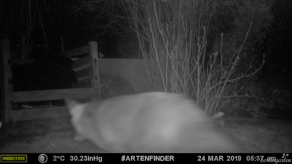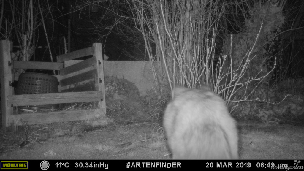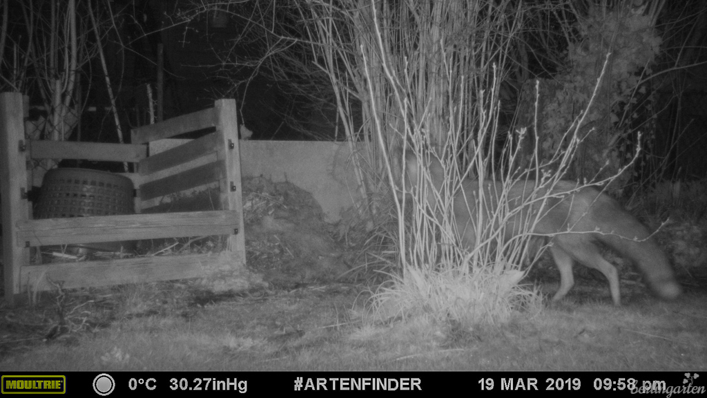 Ein besonderer Service speziell des ArtenFinder Berlin ist die Möglichkeit, sich kostenfrei Wildtierkameras auszuleihen. Im letzten Jahr hatte ich zusammen mit einigen anderen Interessierten der Wilmersdorfer Kolonien Oeynhausen und Friedrichshall rund zwei Wochen lang eine Kamera im Garten. Die Kameras reagieren auf Bewegung und lösen entsprechend aus, wenn ein Wesen vorbeigeht oder -fliegt – Tag und Nacht. Es war daher sinnvoll, die Kamera in Kniehöhe anzubringen und darauf zu achten, dass sich auf dem Bild nichts anderes im Wind bewegt. Die Montage und das Aktivieren waren sehr einfach. Das Ergebnis: natürlich jede Menge Vögel wie Haussperlinge, Meisen, Rotkehlchen, Stare, Buchfinken, Elstern, Nebelkrähen, Türken- und Ringeltauben… Aber auch etliche Rotfüchse, ein Marder (nicht zu erkennen, ob Stein- oder Baummarder), kein Waschbär – aber jede Menge geheimnisvolle Augen. Wie man auf den Fotos unschwer erkennen kann, waren die in meinem Garten im Dunkeln geöffnet und am Kompost unterwegs (dort wohnt eine Mäusesippe), am Tag dann geschlossen von der anstrengenden Völlerei.