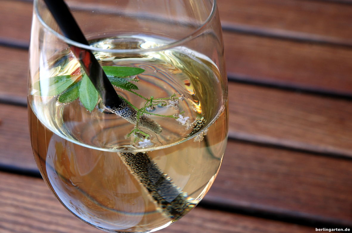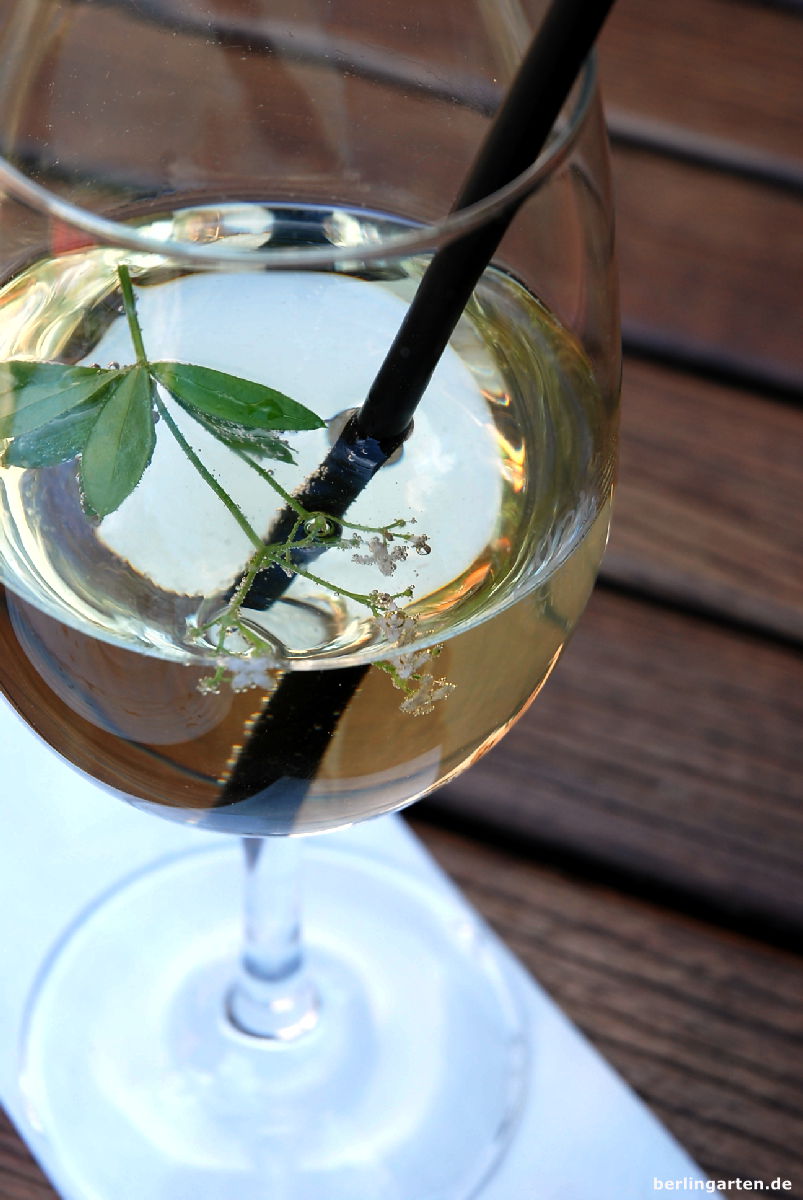 Ich verwende Waldmeister als Bowle oder, wie meist, einfach nur als Wein-Parfumeur. Das geht schneller und ist feierabendalltagstauglich. Dazu nehme ich einen gekühlten trockenen, fruchtigen Weißwein, hänge eine handvoll angetrockneten (!) Waldmeister für 20 Minuten kopfüber hinein und kann dann schon genießen. Meist verfeinere ich aber noch mit einem kleinen Schuss Rosen- oder Pfirsichsirup. Eine Erdbeere im Glas ist auch noch hübsch.