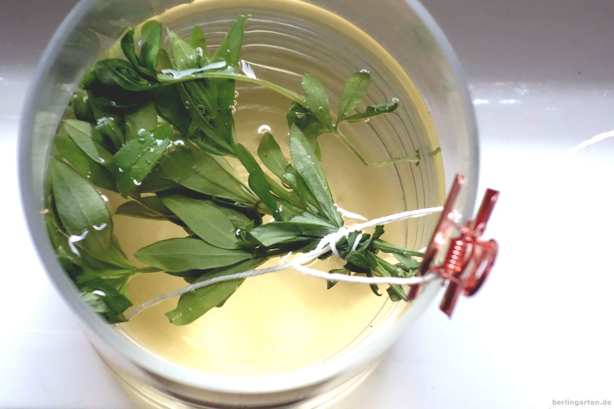 Du  lässt die Blättchen dann einen Tag antrocknen, damit sie ihr volles Aroma entfalten können. Wasser und Zucker bringst du zum Kochen, bis nach etwa zehn Minuten ein klarer Sirup entsteht. Dann kommen die Waldmeisterblätter und die Zitronenscheiben hinzu. Alles muss mindestens einen Tag ziehen.