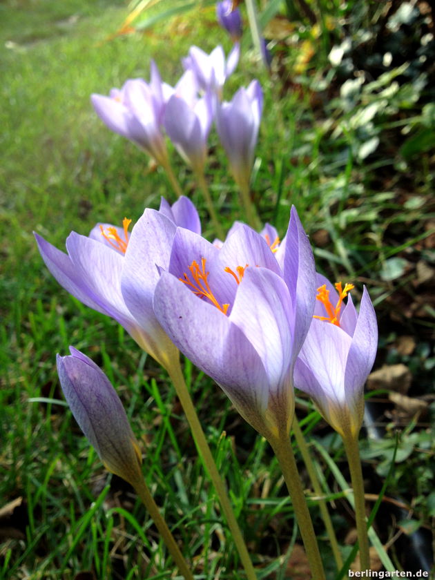 Wichtig für das Gedeihen ist: Der Krokus bevorzugt einen Platz an der Sonne und mag einen durchlässigen, humosen Boden. Es gibt verschiedene Arten im Handel: Der Prachtkrokuss Crocus speciosus wächst bei mir nahezu überall gut und sieht besonders nett als eine Art Spalier am Wegesrand aus. Man kann ihn angeblich aber auch im Rasen gut verwildern lassen, was ich nicht ausprobiert habe, da mir das mit der ganzen Vertekutiererei unpassend erscheint. Vielleicht hast du aber eine echte Wiese und probierst dort den Wiesen-Herbstkrokus Crocus pulchellus aus? Dann bin ich gespannt auf deine Berichte.